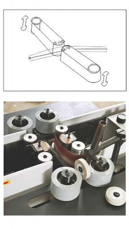 La lijadora de banda para lijado de dos caras (triángulo) procesa ambas caras de los materiales de madera y comúnmente trabaja en conjunto con la lijadora de banda (derecha e izquierda). Estos dos equipos le proporcionan al producto de madera una superficie extra suave.